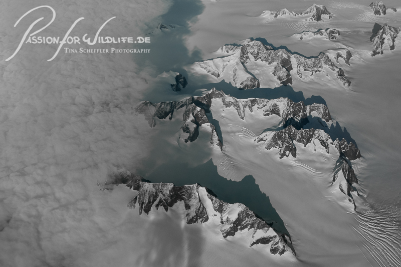 Grönland ist bedeckt von Eismassen. Aus dem Flieger sehe ich nur die Bergspitzen aus dem Eis herausragen. Dies ist unsere erste Alaska-Tour im September.