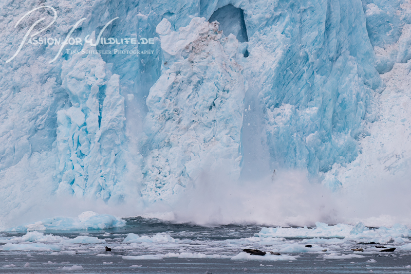 Die Seehunde lassen sich nur wenig von dem kalbenden Gletscher beeindrucken, auch wenn das Eis eine riesige Welle verursacht.