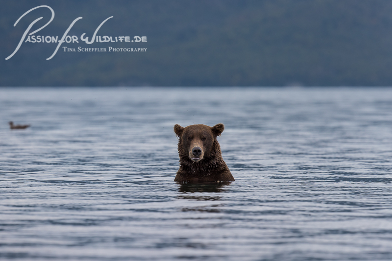 Im Katmai Nationalpark treffen wir schnell auf die erste Bärin. Sie sucht das seichte Wasser des Sees nach Lachsen ab.