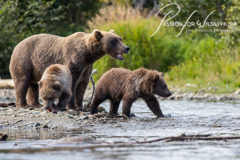 Etwas entfernt an einem Bach treffen wir dann auf eine weitere Bärenmutter. Sie nimmt uns wahr, fühlt sich aber nicht von uns gestört.