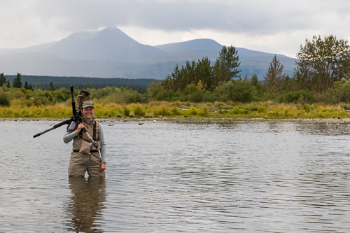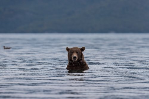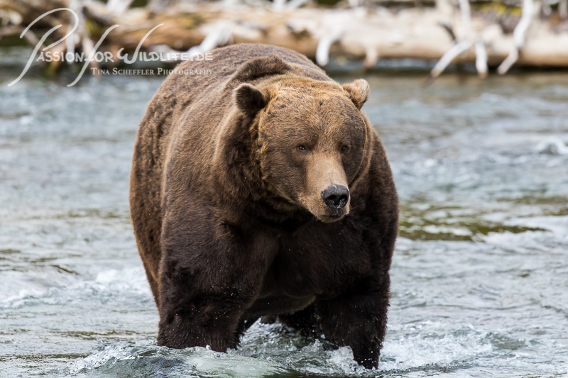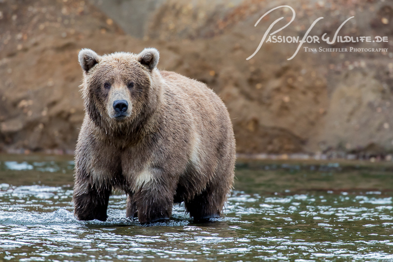 Mit einer Wathose ausgestattet geht es dann auch durch den Brooks River zu den Wasserfällen - Begegnungen auf Augenhöhe inklusive.