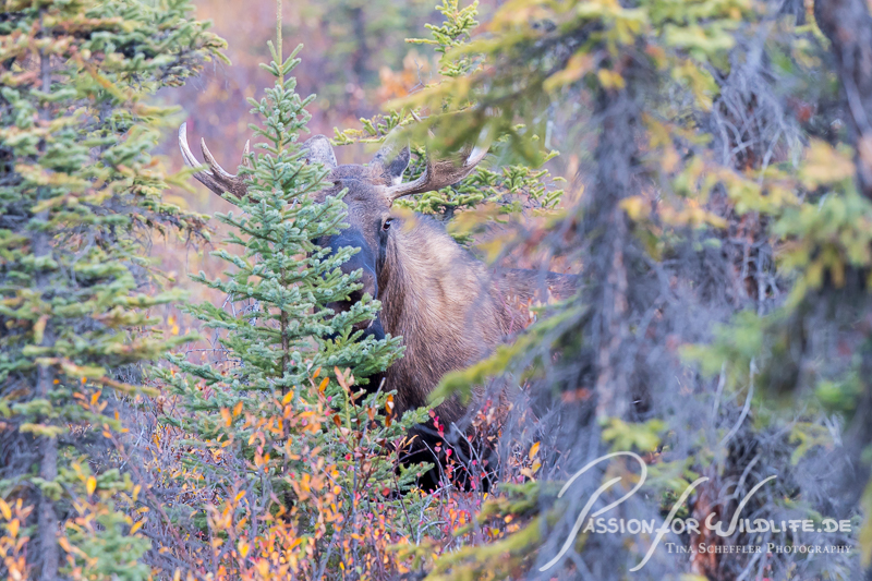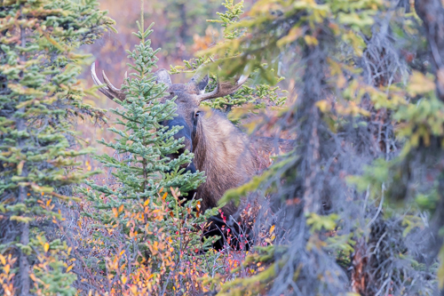 Wer genau hinguckt, entdeckt zwischen den Bäumen den einen oder anderen Elch. Hier ein junger Bulle.