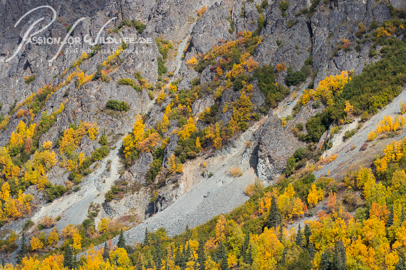 Die schroffe graue Feldwand bildet einen starken Kontrast zu den verfärbten Büschen.