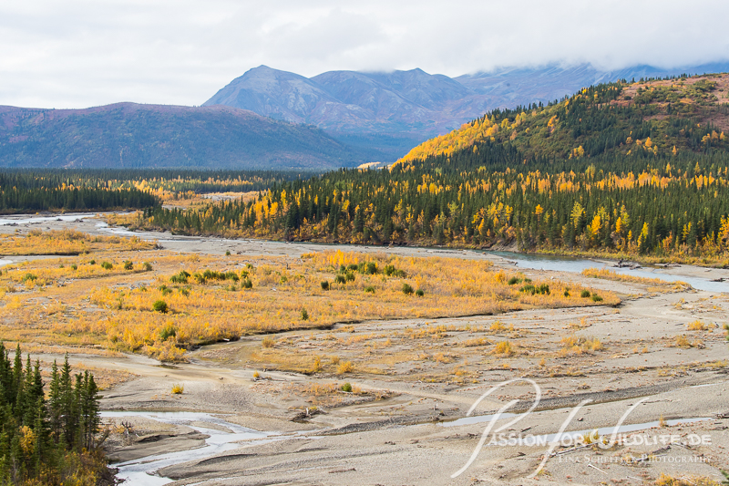 Die weiten Flußtäler sind von den gelben Blättern in Szene gesetzt.