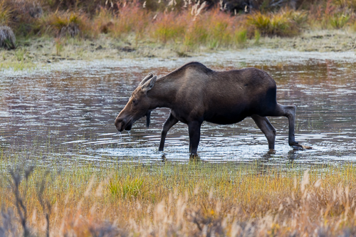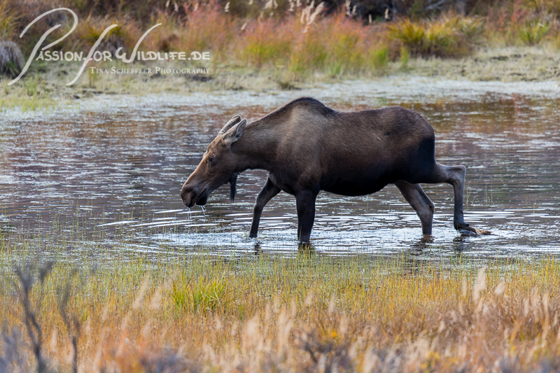 Wir können unser Glück kaum fassen, als wir diese Elchkuh mit ihrem Kalb inmitten eines Tümpels entdecken.