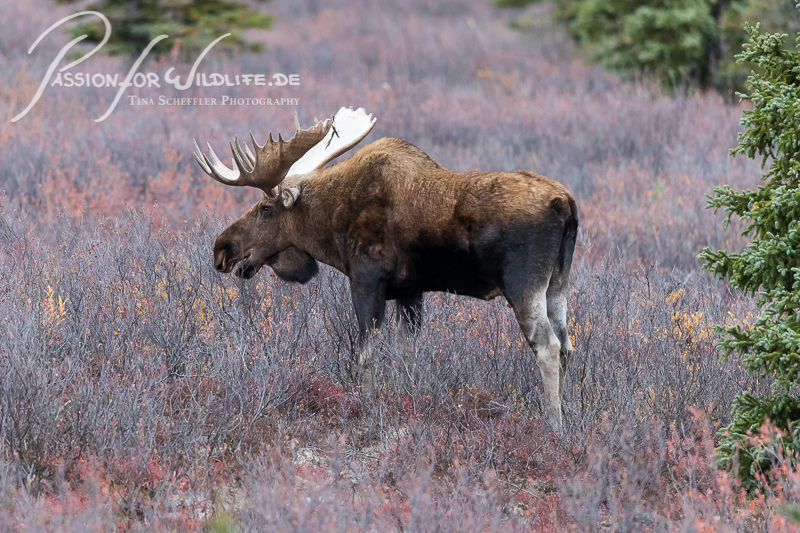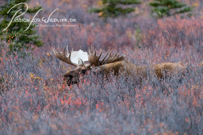Im hohen Buschwerk ist selbst so ein massiver Elchbulle wie dieser nur schwer zu entdecken.