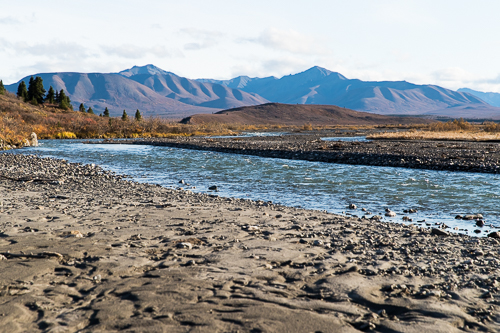 Im Denali Nationalpark erwartet uns traumhaftes Wetter und ein freier Blick auf das Gebirge am Savage River.