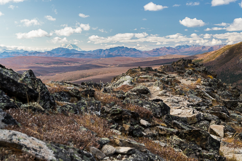 Der Blick auf die Landschaft und den Berg Denali entschädigt für den steilen Anstieg am Savage Alpine Wanderweg.