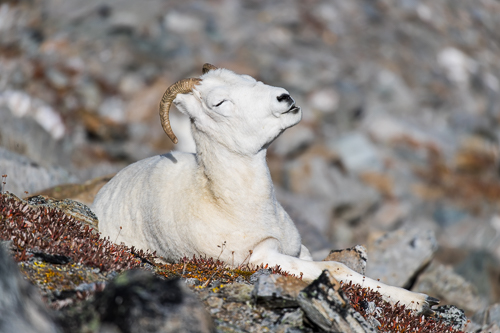 Etwas weiter entfernt liegen weitere Dallschafe am Hang und genießen die Sonnenstrahlen beim Wiederkäuen.
