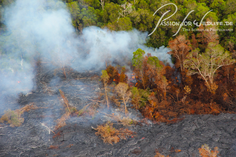 Aus dem Helikopter heraus kann man zusehen, wie die Lava durch die Landschaft „frisst“. Alles, was sich auf ihrem Weg befindet, wird unter Feuer begraben.
