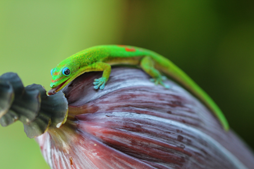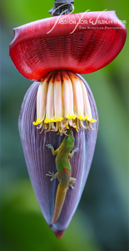 Morgens warten die Goldstaub-Taggeckos darauf, dass sich die Bananenblüten öffnen. Dann schlecken sie den süßen Blütensaft.