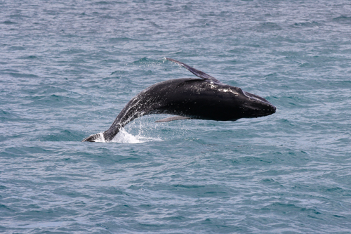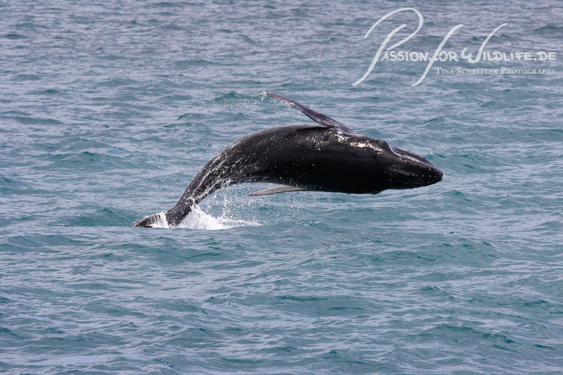 Das Springen kräftigt die Kondition der Wale. Bei diesem Buckelwalkalb klappt es auch schon ganz gut.