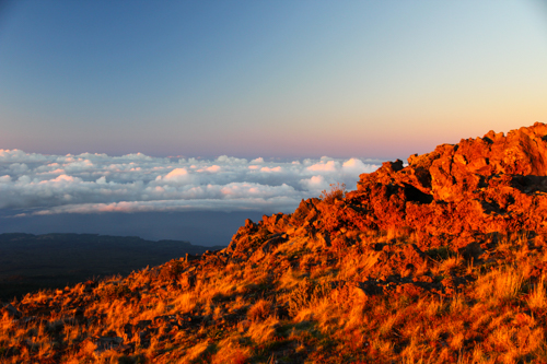 Der Sonnenuntergang auf dem Haleakalā Vulkan auf Maui setzt farblich die ganze Umgebung in Flammen.