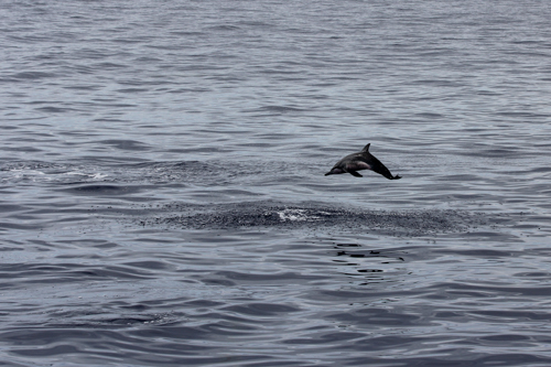 Auch Delfine üben das Springen. Hier ist ein sehr junger Delfin zu sehen.