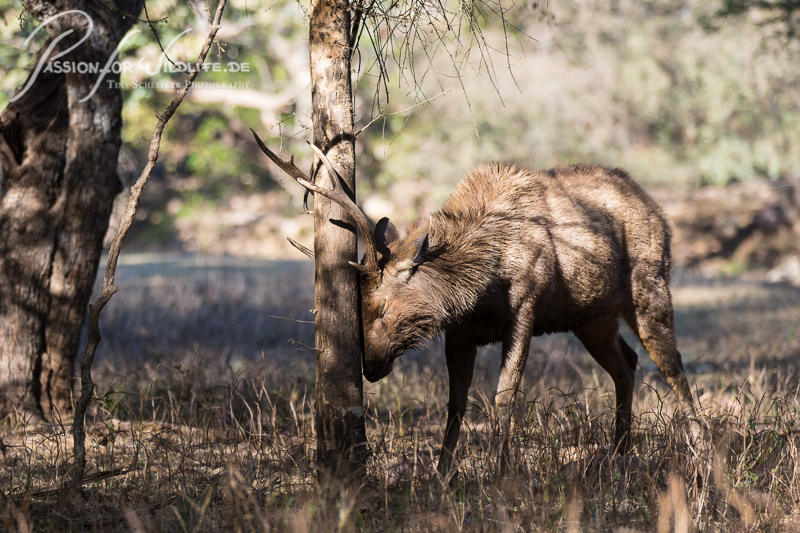 Sambarhirsch beim Schubbern an einem Baum