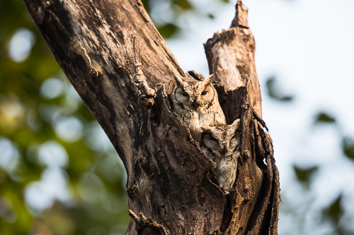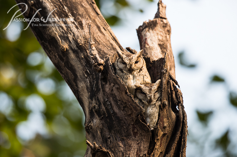 Zwergohreulen (collared scops owls) im Baumstamm
