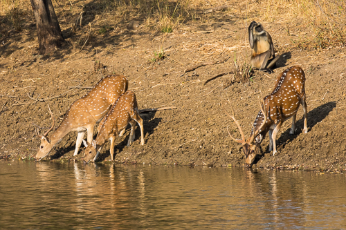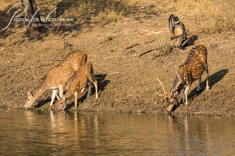 Axishirsche und Langurenaffe am Wasserloch