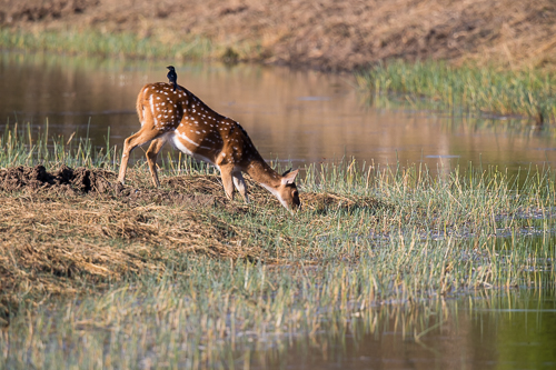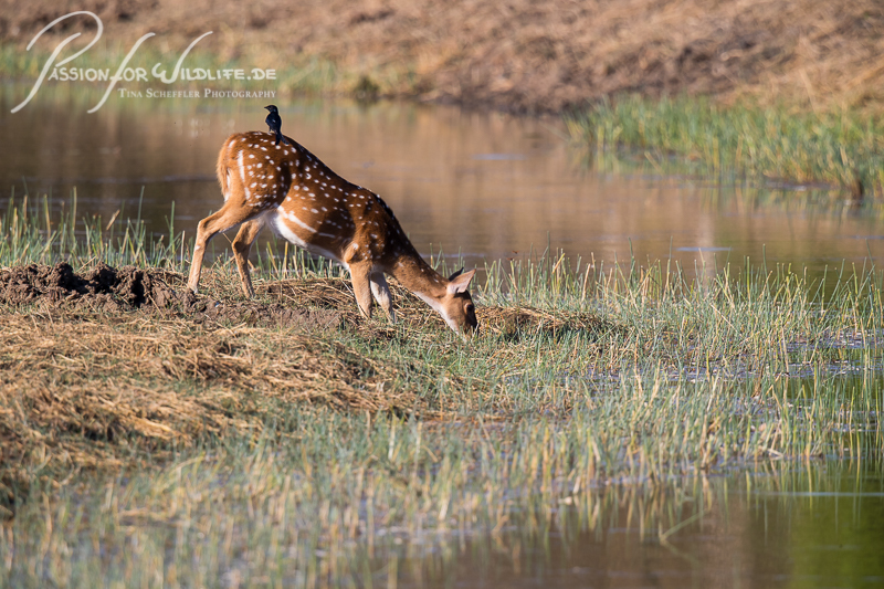 Axishirsch (spotted deer) am Wasserloch mit Königsdrongo (black drongo) auf dem Rücken