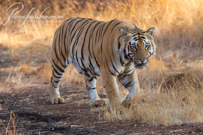 Tigermännchen trottet parallel zu unserem Jeep