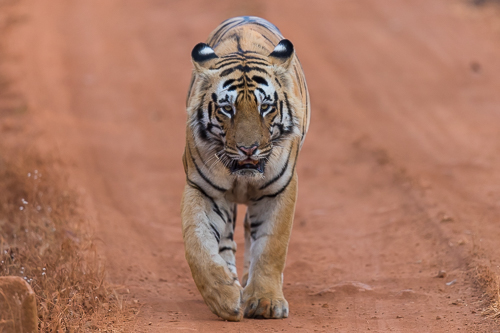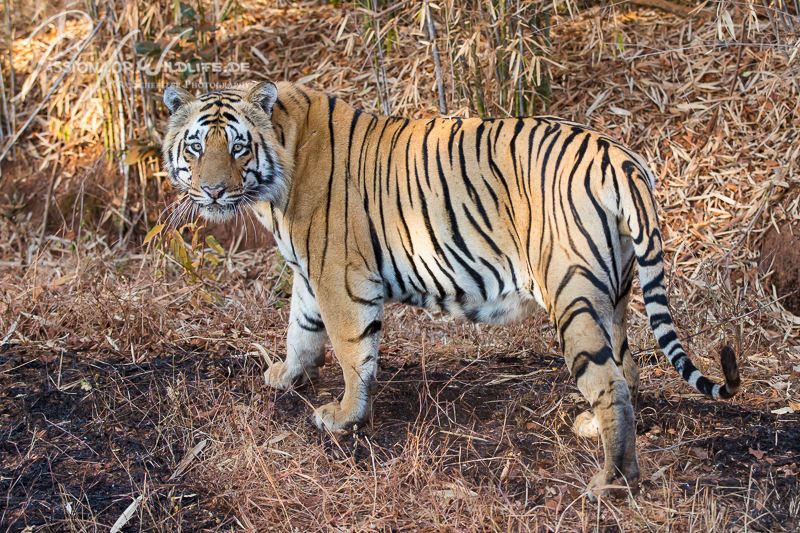 Tigerweibchen beim Überqueren des Weges im Bandharvgarh Nationalpark