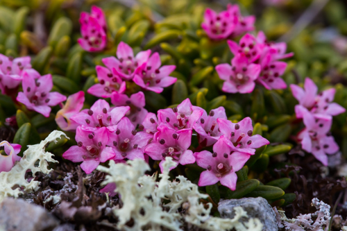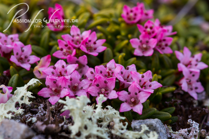 Im Fjell sind überall Alpenazaleen zwischen den Moosen und Steinen. Sie sorgen für pinke Farbtupfer.