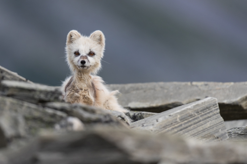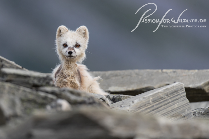 Im Fjell treffen wir auf diese Polarfüchsin. Nach einiger Zeit hat sie sich an uns gewöhnt und guckt uns neugierig an.
