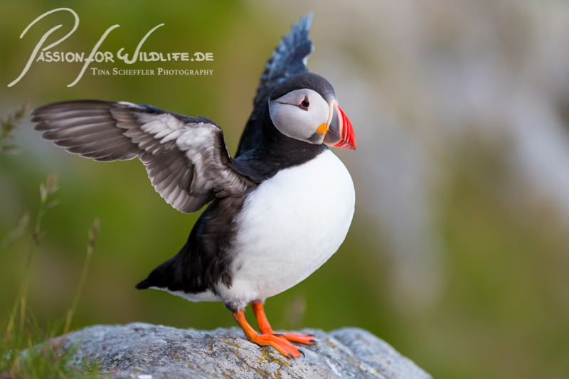 Wenn sich die Papageientaucher strecken und die Flügel schlagen, stülpen sie ihren kleinen weißen Bauch weit nach vorne.