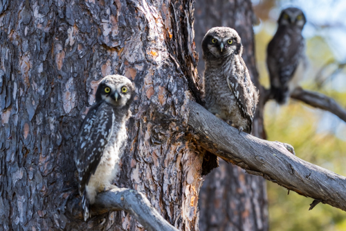Einige hundert Meter weiter treffen wir auf eine weitere Familie von Sperbereulen. Innerhalb kurzer Zeit sehen wir so 15 (!) Tiere.