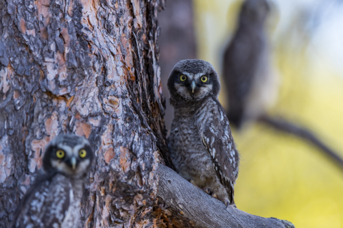 Die jungen Sperbereulen sind inmitten der Fichten gut getarnt. Vor den Baumstämmen verschwimmen ihre Umrisse.