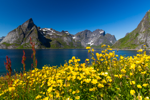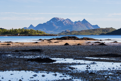 Bei Hamnøy gibt es dann auch die typischen Eindrücke von den Lofoten: kleine Fischerdörfer und große Berge, die sich bei Windstille im Wasser spiegeln.