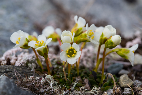 Daneben blühen auch die Diapensien mit ihren zarten, weißen Blüten.
