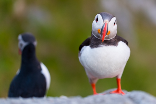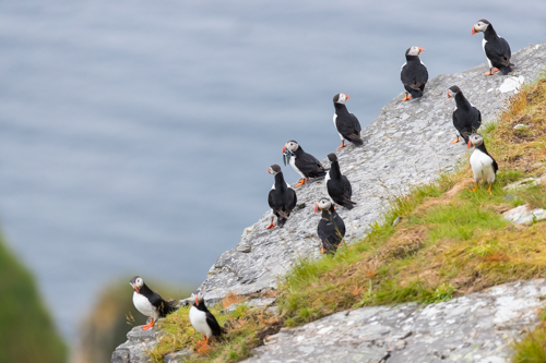 An der Küste geht es direkt zu den Vogelfelsen, an denen knapp 30.000 Papageientaucherpaare brüten.