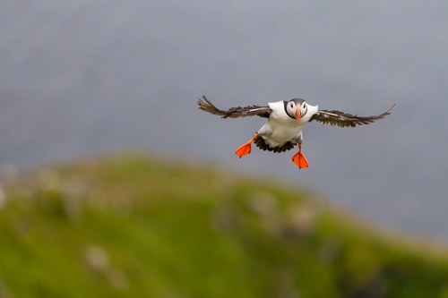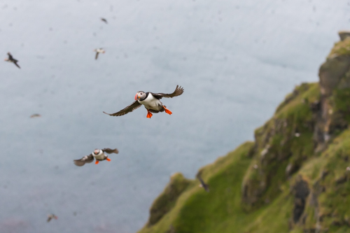 Ständig sausen Papageientaucher an uns vorbei oder sogar direkt auf uns zu - fotografisch ist dies sehr herausfordernd.