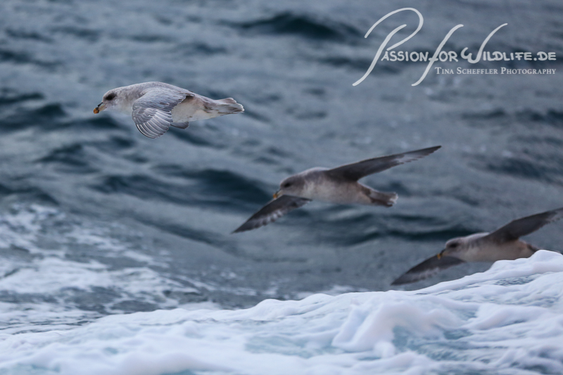 Auf der stürmischen Rückfahrt begrüßten uns diese Eissturmvögel. Sie hatten sichtlich Freude an dem Wind