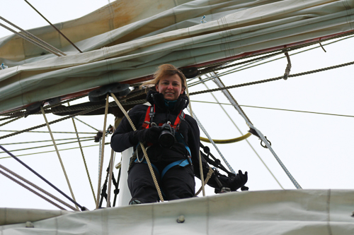 Die Fotografin oben auf dem Mast