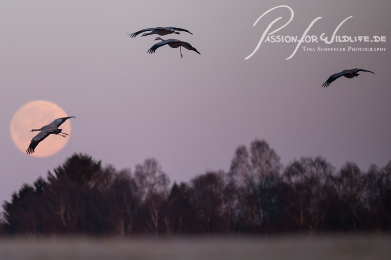 Mit dem untergehenden Mond und der aufgehenden Sonne kommen die ersten Kraniche angeflogen.