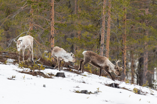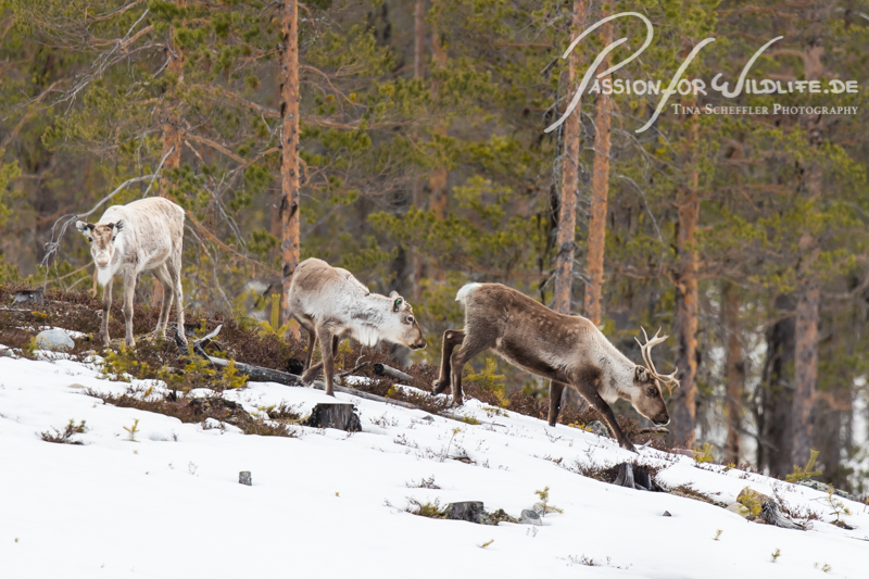 Auf und neben den Straßen treffen wir immer wieder auf Rentiere. Die Tiere sind domestiziert, laufen jedoch frei in großen Gebieten herum.