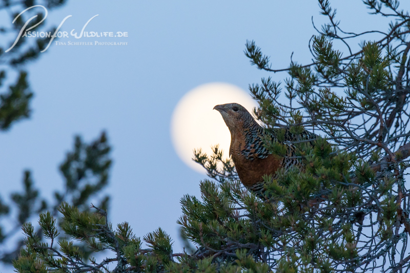 Später flog sie auf einen Baum. Von dort aus rief sie, während im Hintergrund der Vollmond aufging.
