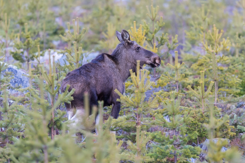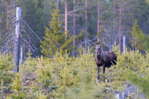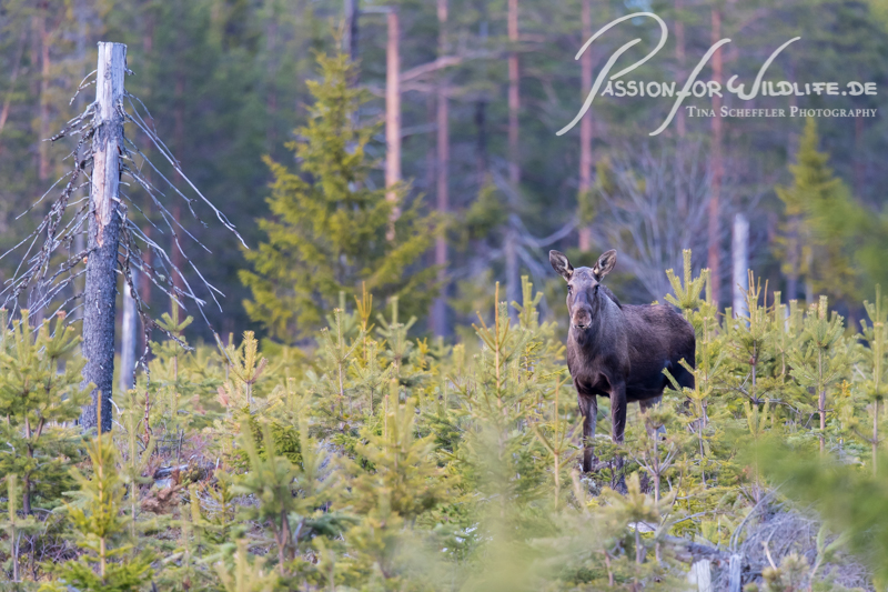 Diesen Elch entdeckten wir kurz vor Sonnenuntergang in einem jungen Tannenwald.