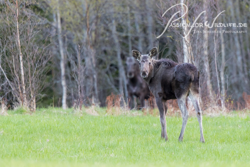 Während der kleine Elch auf der saftigen Wiese graste und immer wieder hoch schaute, bewegte sich die Mutter nicht aus dem Unterholz heraus.
