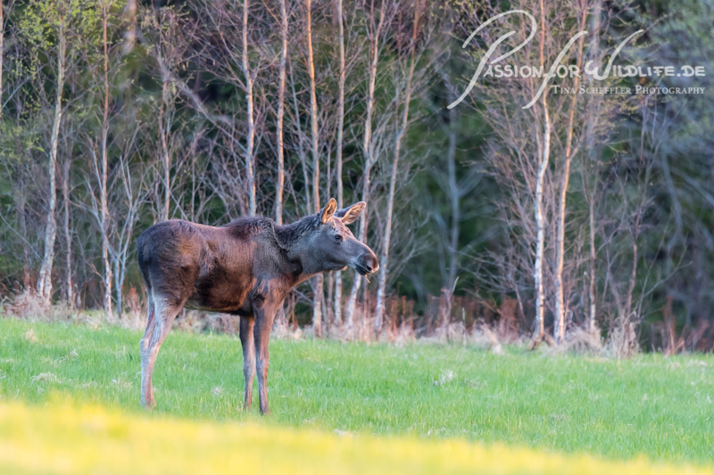 Je weiter die Sonne unterging, desto weiter traute sich der kleine Elch auf die Wiese.
