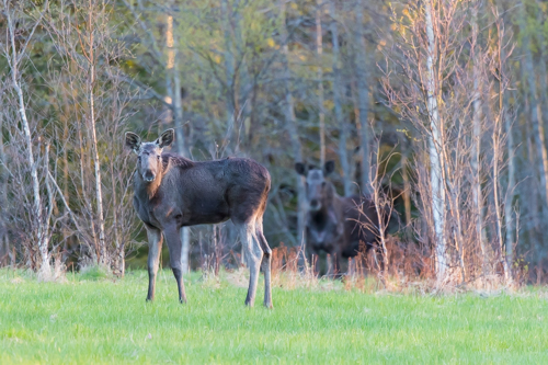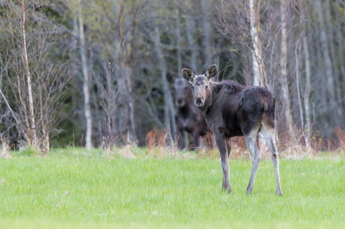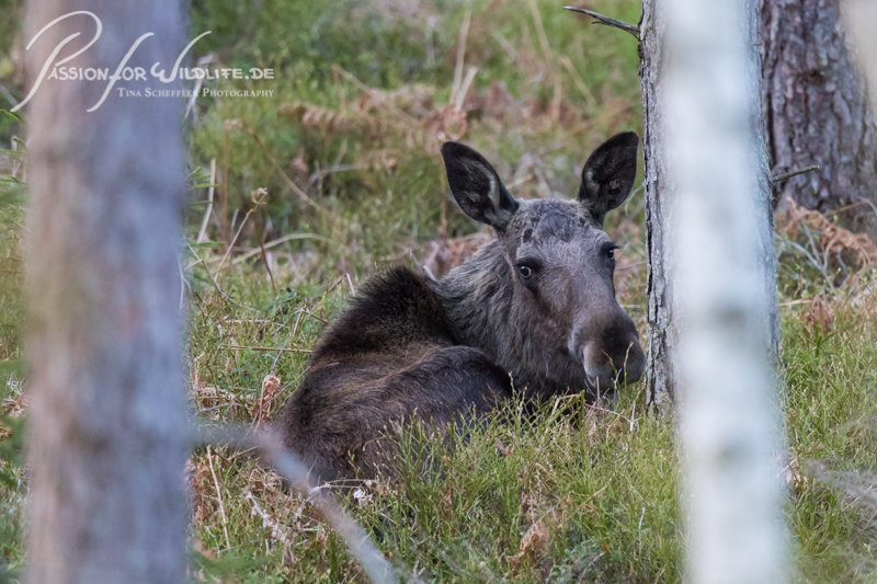 Zurück in Südschweden entdeckten wir diesen jungen Elch auf einer Wiese. Erst auf den zweiten Blick entdeckten wir die Elchmutter im Hintergrund.